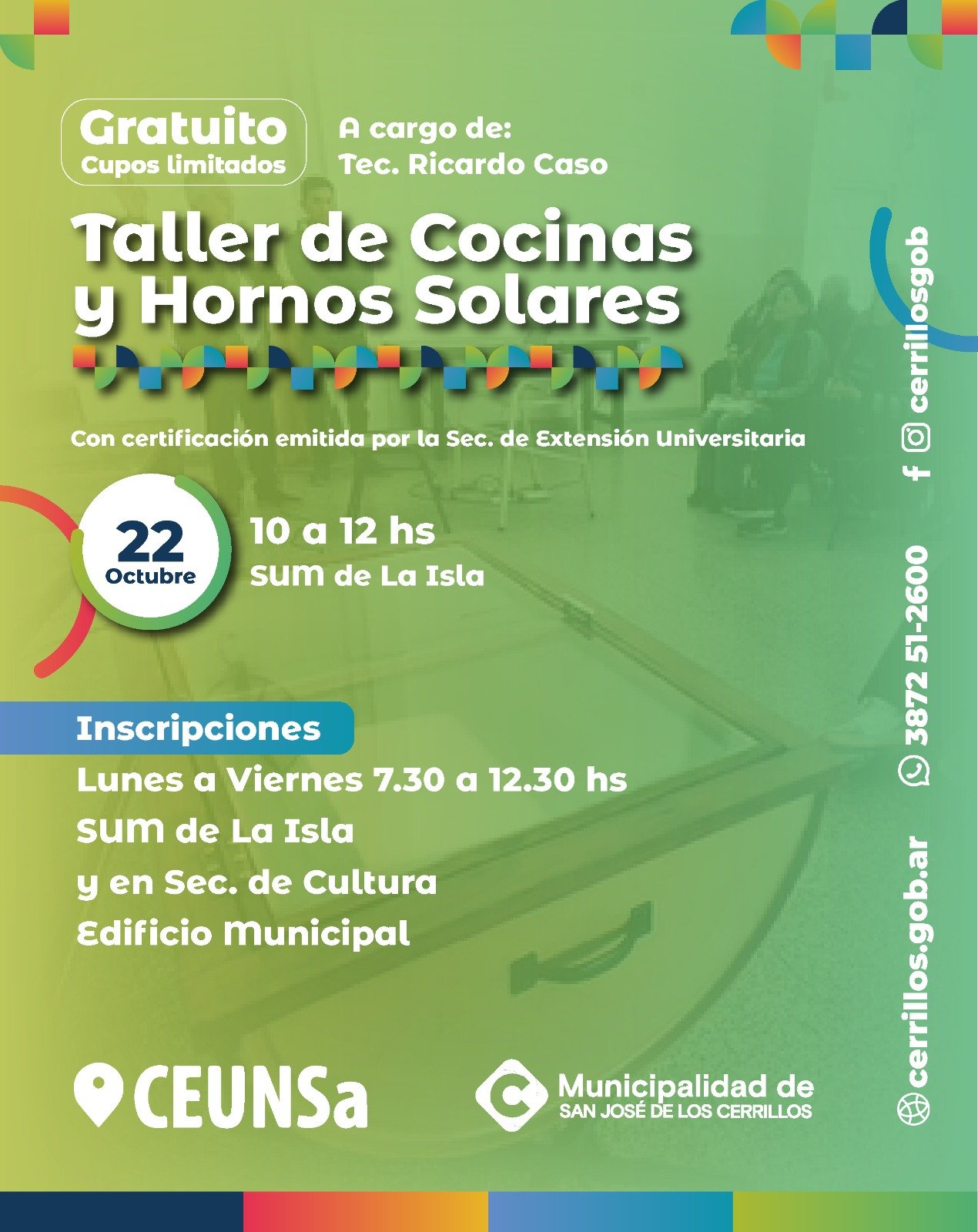 La Municipalidad de Cerrillos junto al CEUNSa invita a los vecinos de la Isla a participar del Taller de construcci贸n de cocinas y hornos solares a cargo del Tec. Ricardo Caso. El curso se dictar谩 este martes 22 el SUM de la Isla.