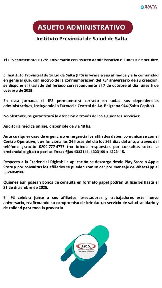 El Instituto Provincial de Salud de Salta (IPS) informa a sus afiliados y a la comunidad en general que, con motivo de la conmemoración del 75° aniversario de su creación, se dispone el traslado del feriado correspondiente al 7 de octubre al día lunes 6 de octubre de 2025.