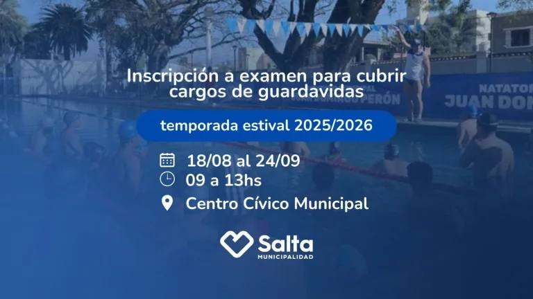 La Agencia Salta Deportes de la Municipalidad, comunica que las inscripciones para cubrir el cargo de guardavidas para la temporada estival 2025/26 cierran este miércoles, 24 de septiembre. Los interesados pueden registrarse en el Centro Cívico Municipal (CCM) de 9 a 13.