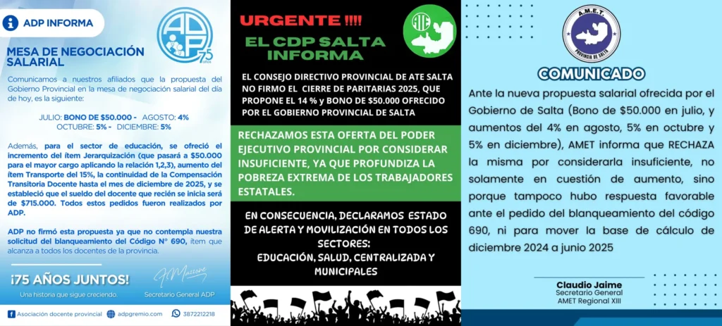 Por su parte, el Consejo Directivo Provincial de ATE Salta tampoco aceptó el ofrecimiento “por considerar insuficiente, ya que profundiza la pobreza extrema de los trabajadores estatales”.