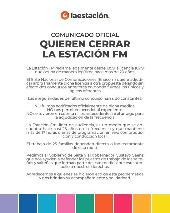 En el canal de youtube de la radio, el director, Tomás Trippel, expresó que “nos duele ver los mensajes de la gente que dice que no nos puede escuchar. Llevamos más de dos décadas trabajando en este dial, con programas hechos por y para los salteños, generando trabajo y contenidos locales. No somos ilegales, siempre hicimos los trámites como correspondía y hoy nos toca dar estas explicaciones porque hay muchos intereses detrás”.Según relataron en el programa conducido por Martin Herrera Couto y Mercedes Moreno, la emisora ocupa el 107.9 desde 1999, primero con Radio Panda y luego como La Estación. Durante ese tiempo participaron de todos los procesos formales de licitación ante el entonces CONFER, luego AFSCA y actualmente ENACOM. Sin embargo, en la última convocatoria realizada entre 2022 y 2023, la licencia fue otorgada a otra persona, pese a que La Estación fue el único oferente en dos instancias y acreditó arraigo, audiencia y trayectoria.“Es indignante que el ENACOM valore más una promesa de radio que una emisora que ya existe, tiene reconocimiento, audiencia y genera trabajo. Por eso presentamos una demanda judicial. Si fuéramos ilegales, no iríamos a la Justicia, pero tenemos todo en regla y vamos a defenderlo hasta el final”, remarcó.